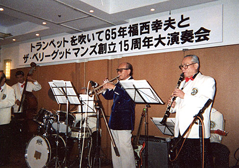 国賠訴訟の原告団長、福西税理士=写真の右から二人目。パリでチンドン屋を繰り出すなど破天荒な音楽家の一面も。